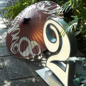 These umbrellas are used to welcome guests to the restaurant. The pure white umbrellas have beautiful black lettering.