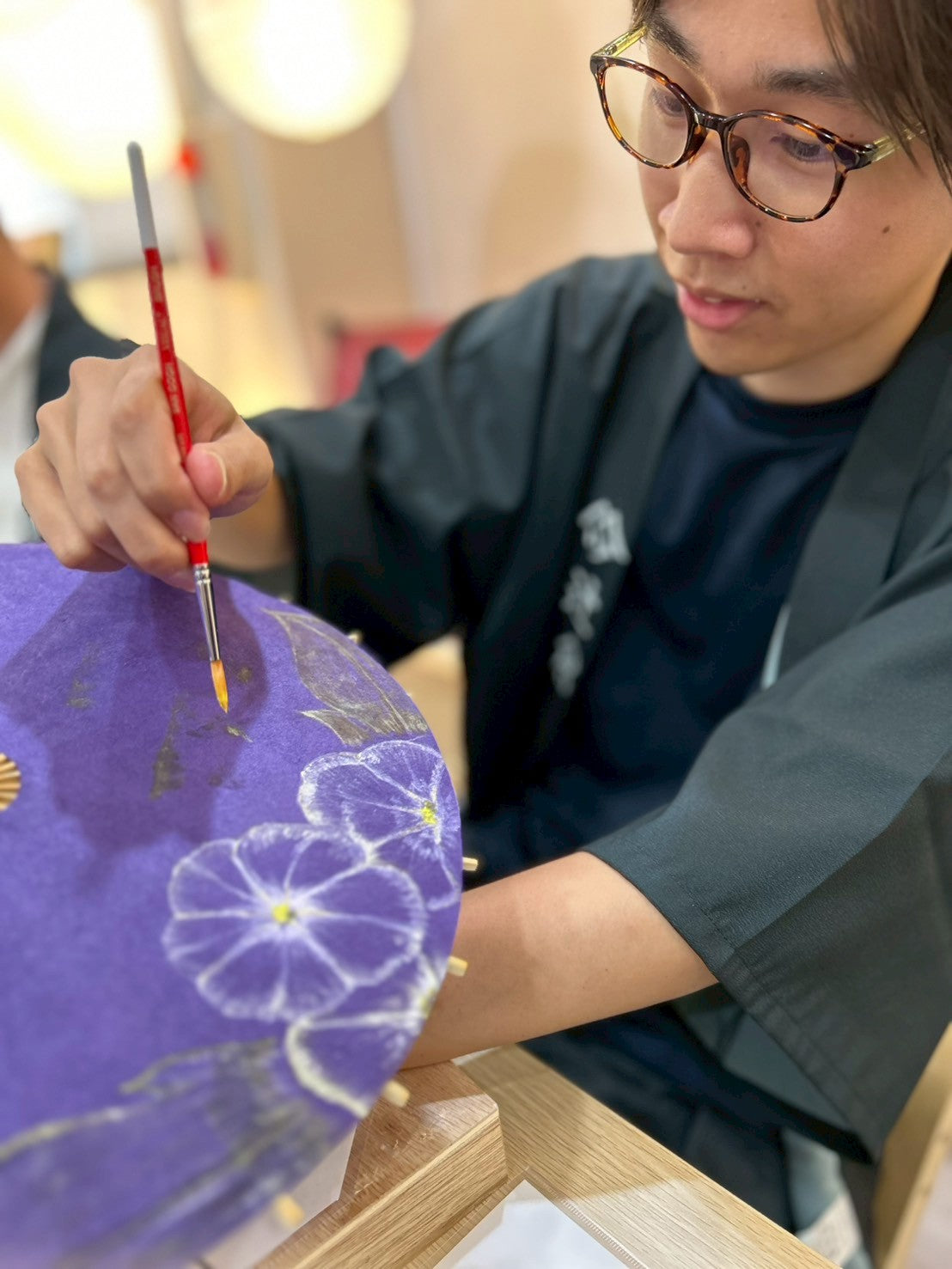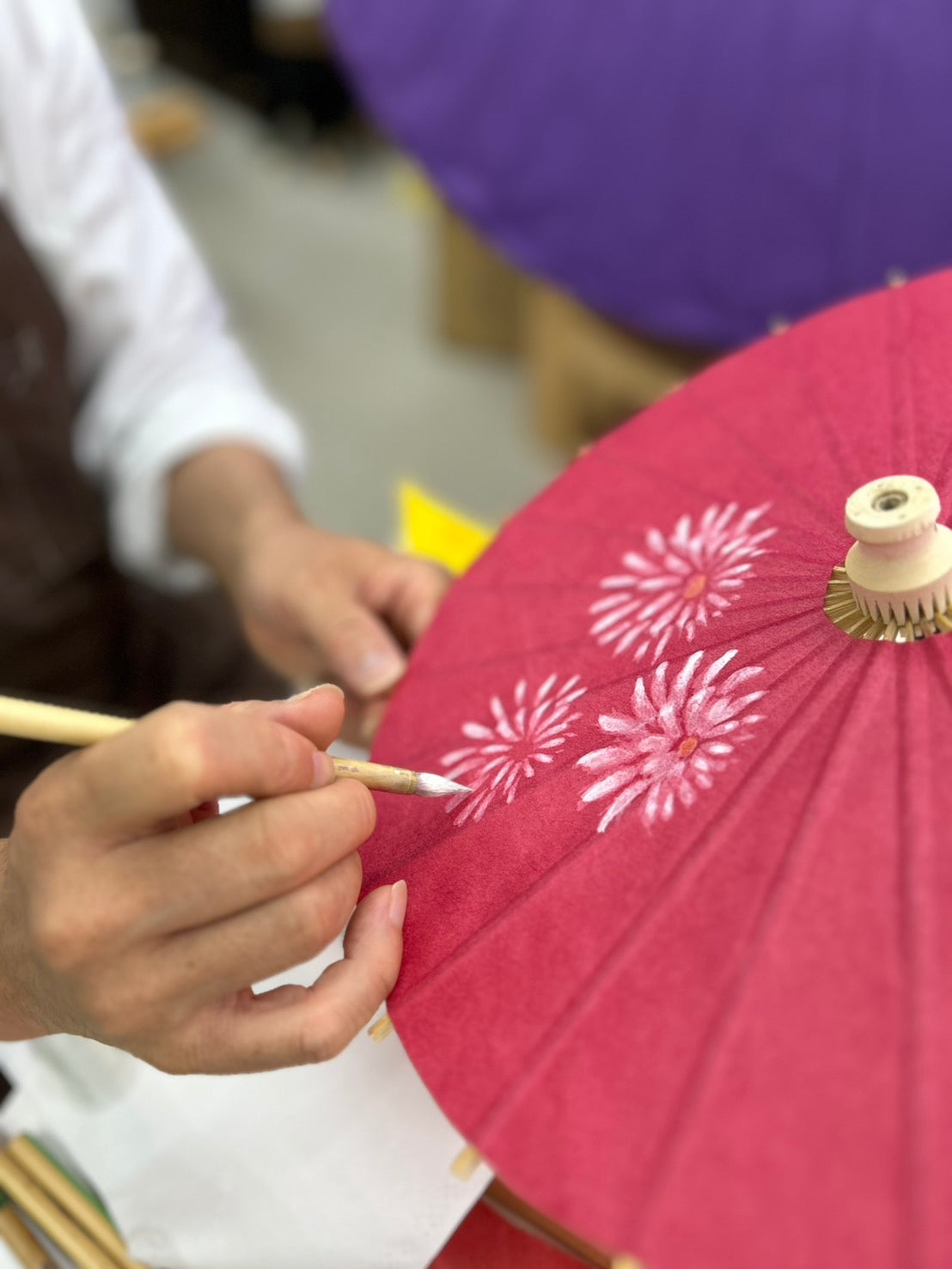 日本製の素材を用いた『姫和傘』へ、伝統文様や自由な絵柄を手描きで彩ります。