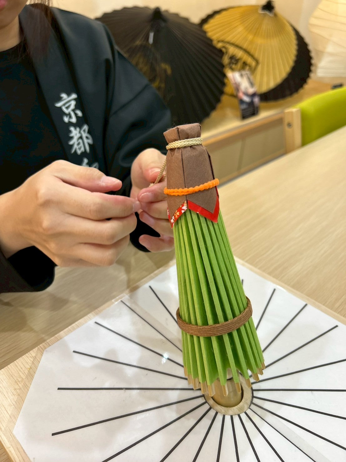 和紙に折りつけをして、和紙の頭紙を装着して和傘に仕立てていきます。