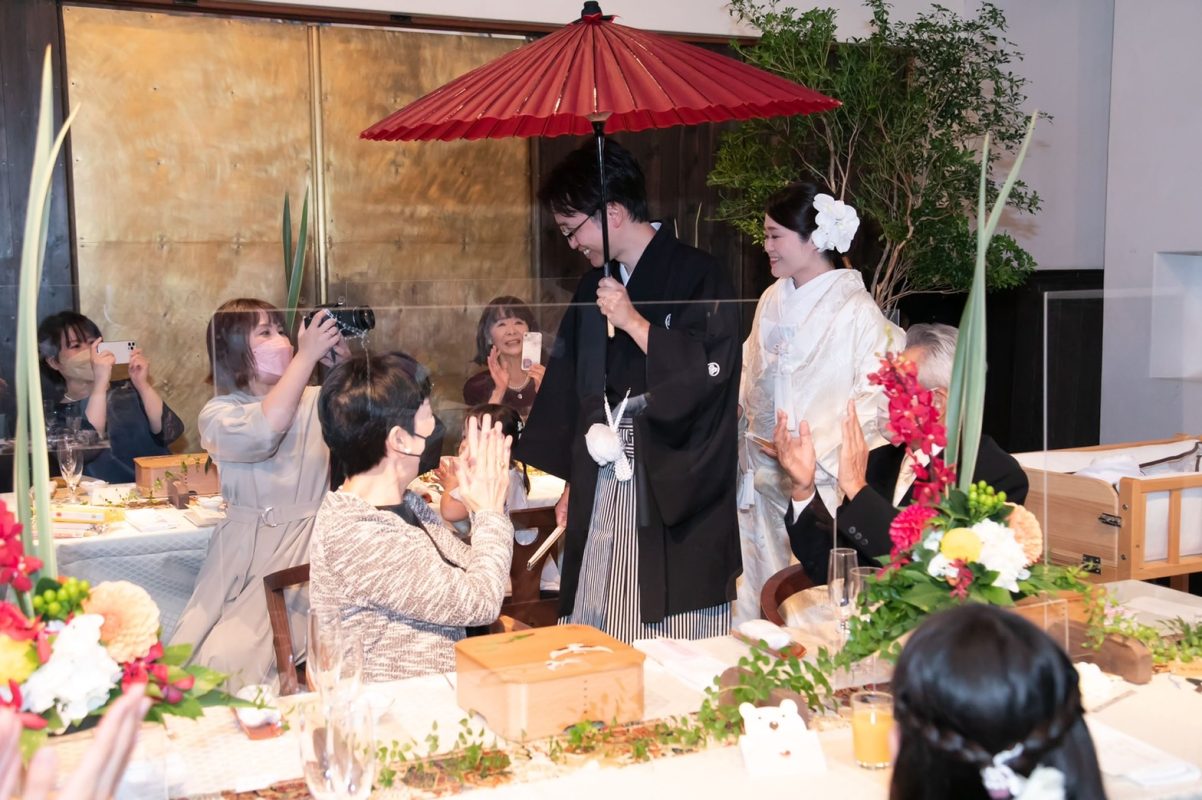 傘を広げると、末広がりの形から「降り注ぐ困難から守ります」「一つ屋根の下末永く幸せに」という思いも込め